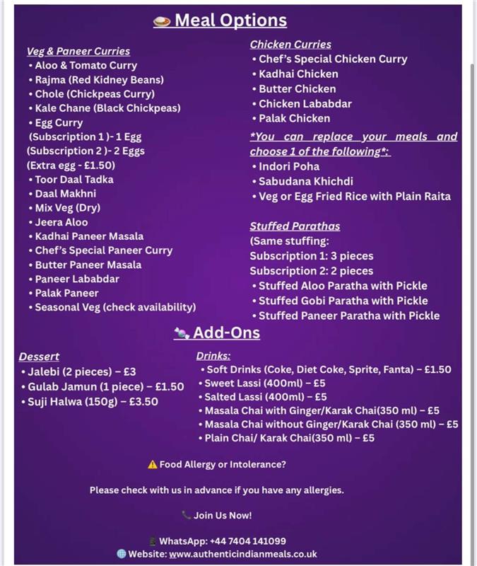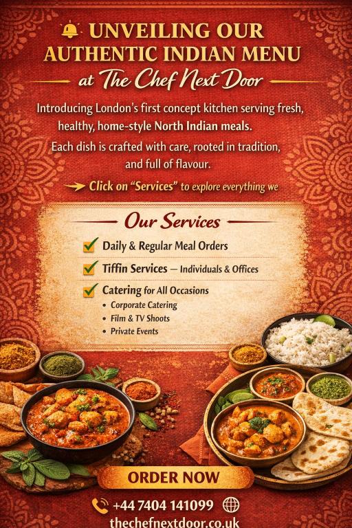 Inspired by my mother’s home-cooked recipes and my father’s dream, Authentic Indian Meals – Ghar Jaisa Swaad (Just Like Home) was created to bring fresh, comforting North Indian food to London. Every meal is prepared with care, using traditional recipes and fresh ingredients—just like home. We are proud to introduce The Chef Next Door, by Authentic Indian Meals – Ghar Jaisa Swaad—a concept kitchen, not a regular takeaway, serving fresh, home-style Indian food and accommodating your taste. Every dish is prepared with care, using traditional techniques and fresh ingredients, just like it would be at home. These are more than meals — they are memories, passed down through generations and shared with love