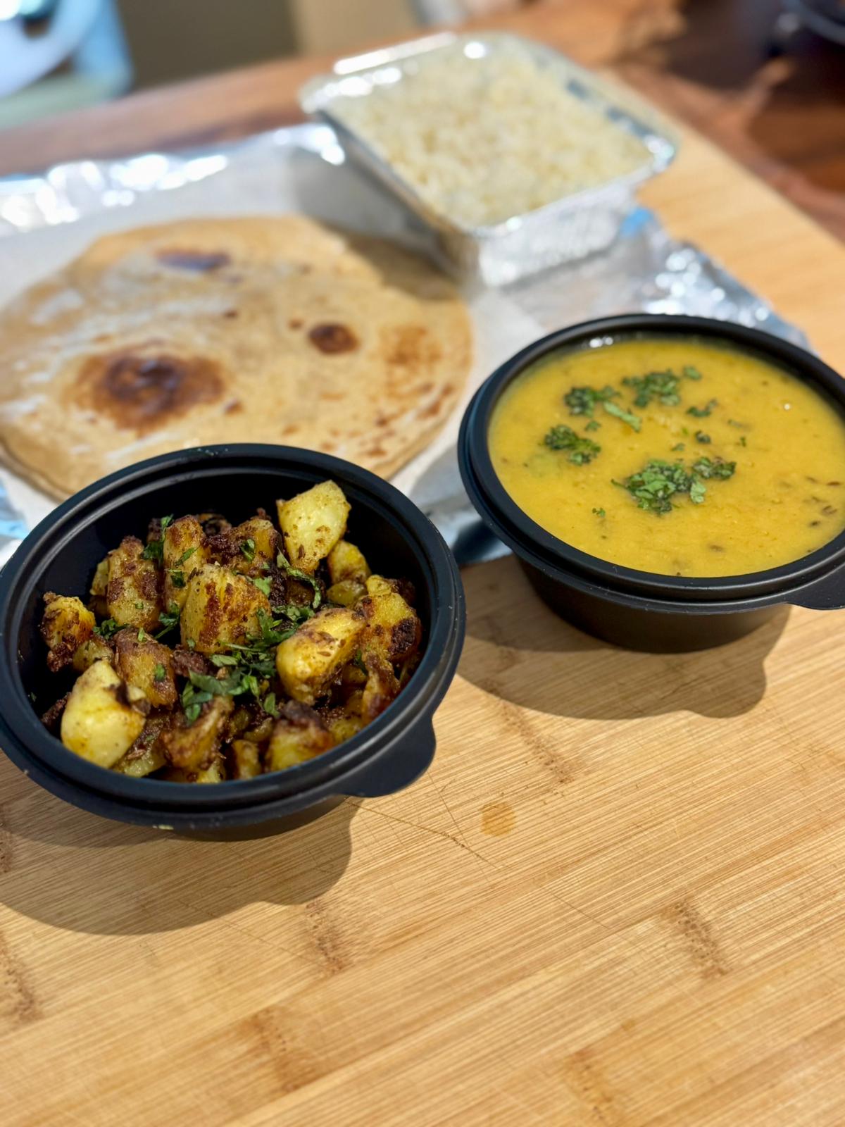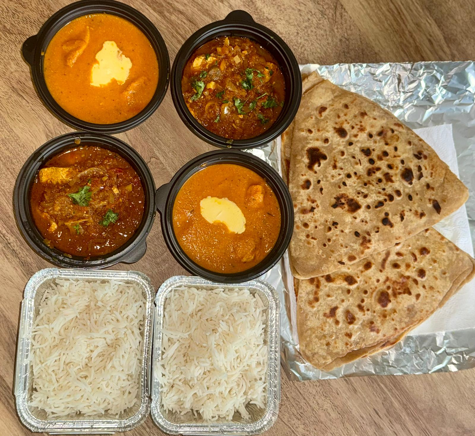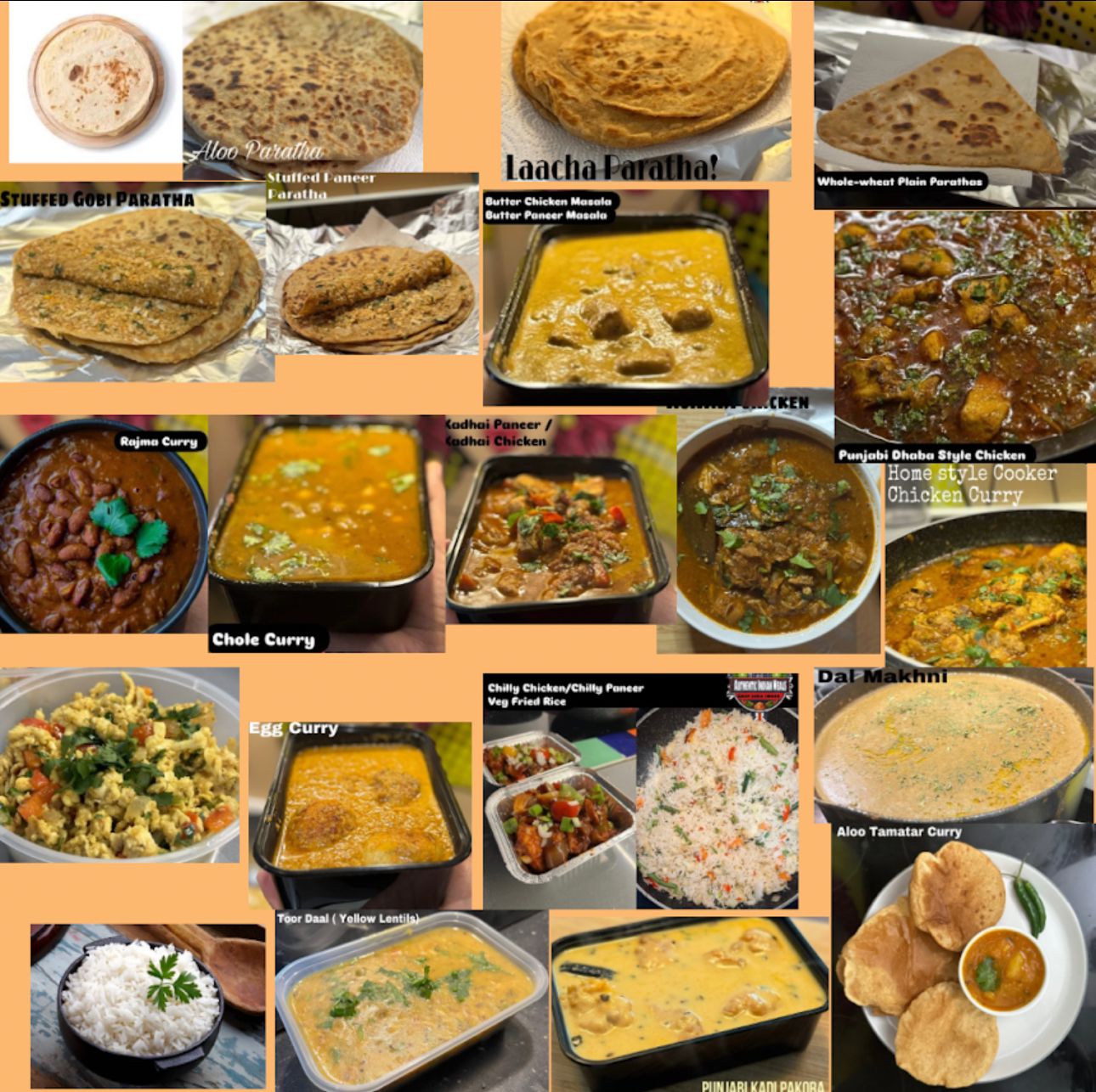 Gallery images of homestyle Indian meals, catering trays, snacks, and desserts. The gallery reflects everyday cooking prepared for collection and group orders across Bonnet St and nearby London areas.